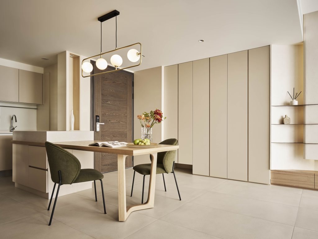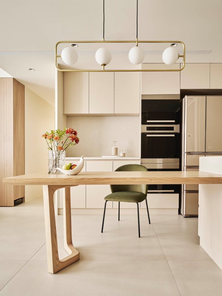 為日後照護寶寶與親友來訪時,有充足的空間滿足機能所需,於是擬定開放式設計,並精準量測左右動線距離,使行步坐臥間饒有餘裕。餐區由中島延伸出餐桌,鏤空的桌腳與燈飾為場域增添輕盈氛圍,而餐櫃廚具則收束至牆面,視覺俐落齊整。客廳以開闊為主旨,不做過多綴飾,將天花板向上推進爭取高度,讓視閾更顯敞亮,偕悠悠日光透進,通透開敞。