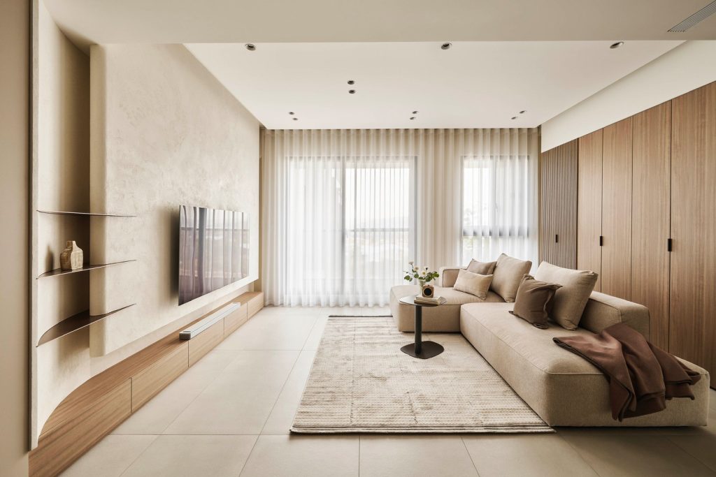 在淨白基底之上,塗覆一層奶油色系,深淺相接堆疊出層次紋理,佐日光調色,繪製一幅名為家的溫潤油彩。伴隨新生命的到來與時序更迭,日常足跡與光影變化,逐一為其上色,更添溫度表情。