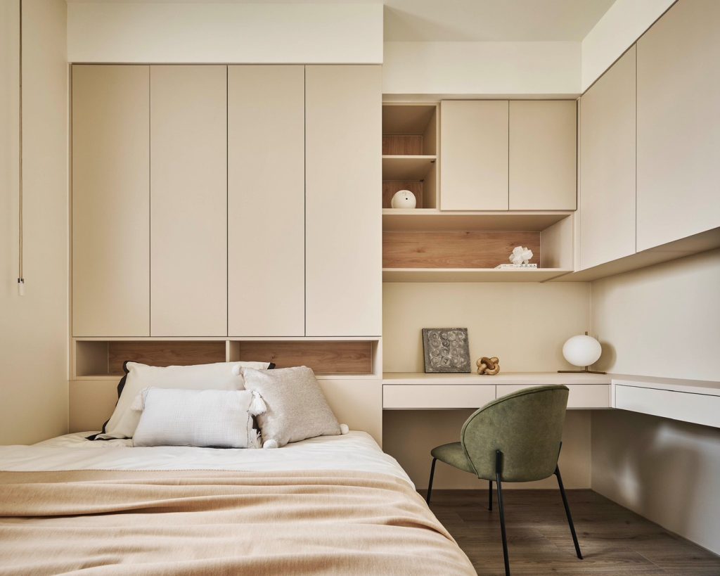 因著業主喜愛奶油色系,以此為基底大面積鋪墊,擴展視覺效果,形塑舒適無壓氛圍,讓男女主人無論在生活起居或照看孩子時,都能感到放鬆自適。