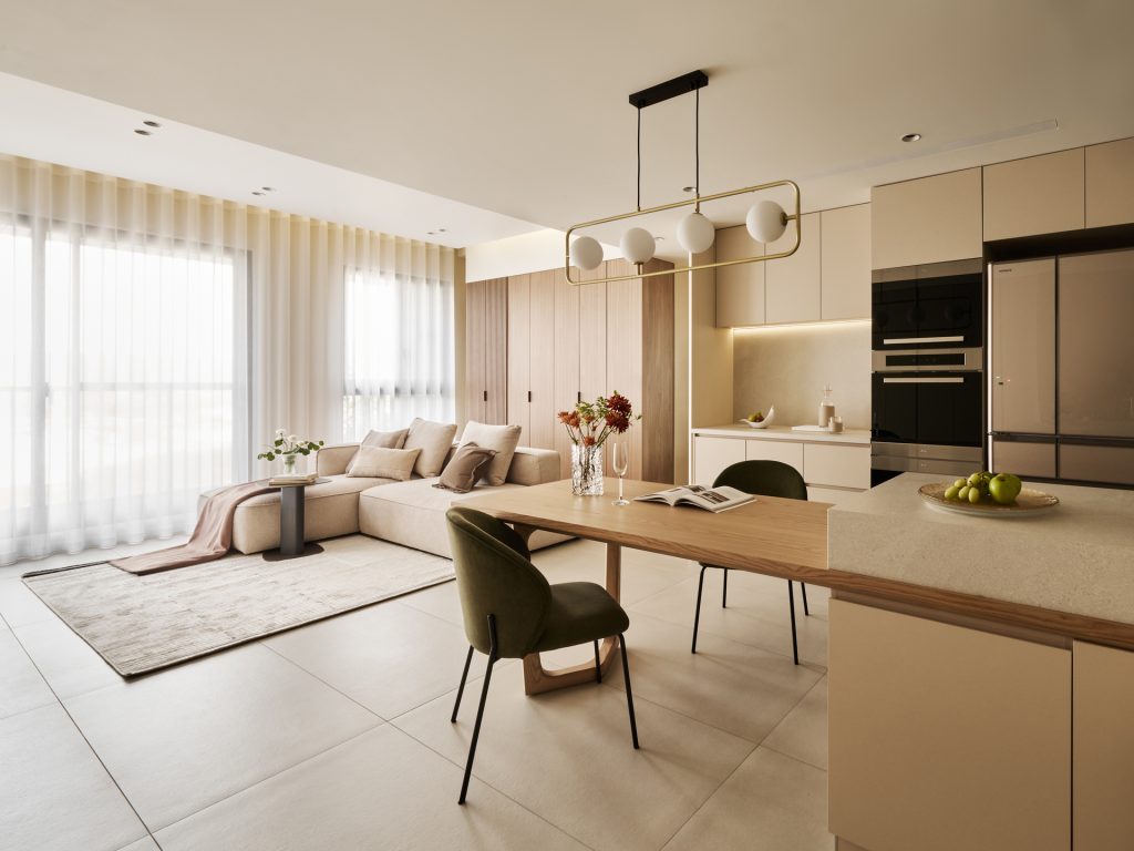 為日後照護寶寶與親友來訪時,有充足的空間滿足機能所需,於是擬定開放式設計,並精準量測左右動線距離,使行步坐臥間饒有餘裕。餐區由中島延伸出餐桌,鏤空的桌腳與燈飾為場域增添輕盈氛圍,而餐櫃廚具則收束至牆面,視覺俐落齊整。客廳以開闊為主旨,不做過多綴飾,將天花板向上推進爭取高度,讓視閾更顯敞亮,偕悠悠日光透進,通透開敞。